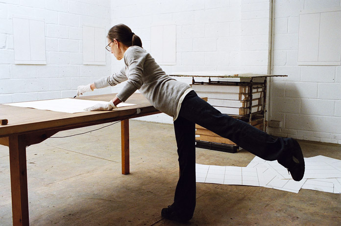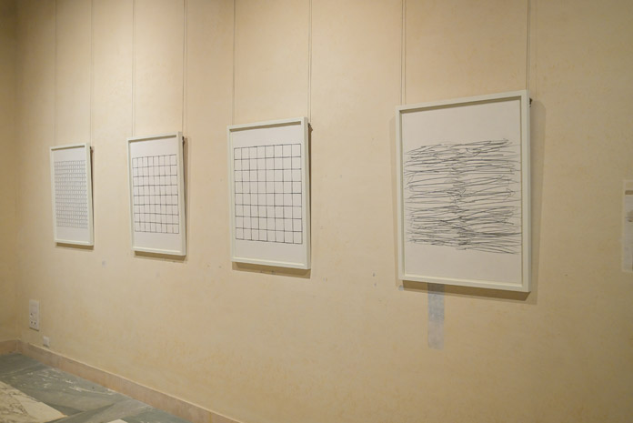 I lavori di Linda Karshan – linee che si intersecano, griglie geometriche, motivi che si ripetono sulla carta in un ordine rigoroso – nascono da un metodo sviluppato nel 1994, che fonde corpo, respiro e numero. Ogni segno corrisponde a un respiro ritmico, la carta ruota in senso antiorario, il movimento coinvolge tutto il corpo, mentre il tempo viene contato secondo un principio musicale.
