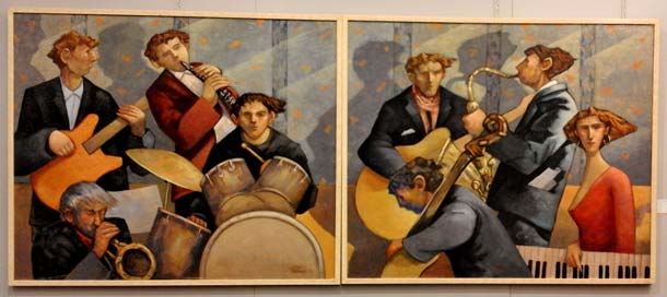 Del livornese Giampaolo Talani, Premio Internazionale “Lorenzo il Magnifico” per le arti visive, meritano menzione due opere. La scultura bronzea Il Marinaio, riprodotto in una versione di venti metri, rispetto al formato a grandezza persona esposto alla Florence Biennale, quale monumento al navigatore fiorentino Amerigo Vespucci per il porto di Miami, nel 2012, in occasione dell’anniversario, e il dittico Musicisti Jazz che riporta in primo piano la tecnica dell’affresco su tela, quasi un murale. Un ottetto, formazione base di una big band di sapore americaneggiante, che sembra riportarci alle avanguardie primo ‘900esche, un palcoscenico americano degli anni ’20 o, forse, uno italiano degli anni ’50, riattualizzato ad un secolo di distanza.