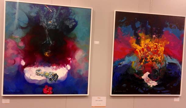 Nelle due variopinte tele a tecnica mista, acrilico e olio, dell’artista turco Fikri Cantürk, si riporta in scena, sotto nuova veste contemporanea, il mito di Adamo ed Eva. Titolo delle tele Reference to the Myth of Adam and Eva. Al centro di entrambe la mela; in quella di sinistra ancora intera, poggiata su un foulard pendente da una candida nube, in quella di destra consumata e circondata da un vortice di passione con una prevalenza di colori caldi.