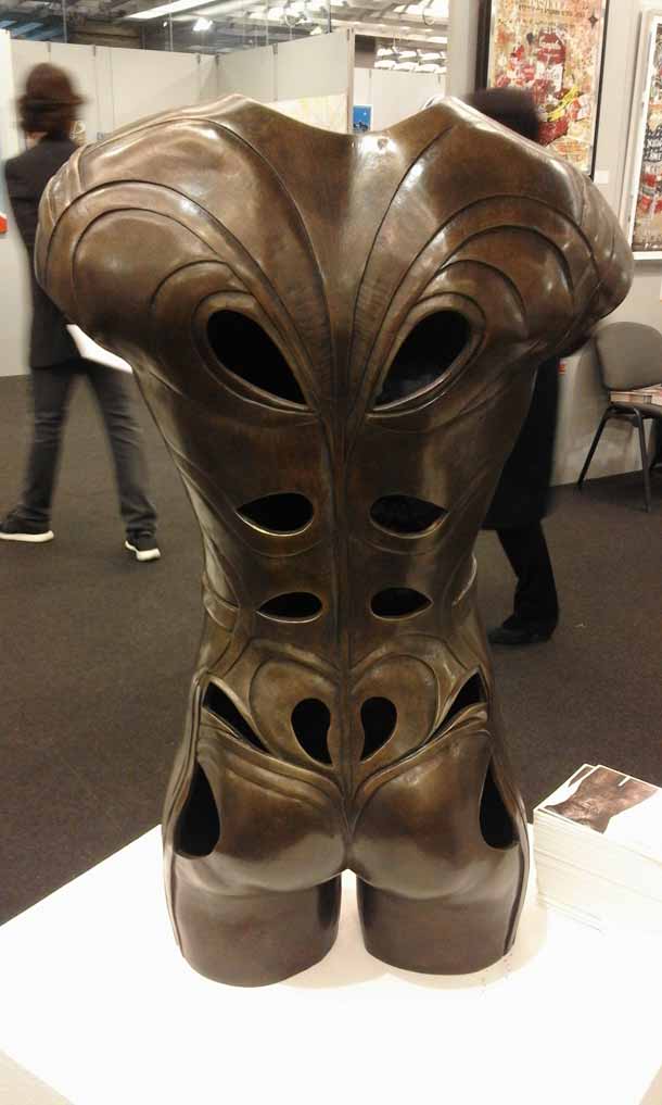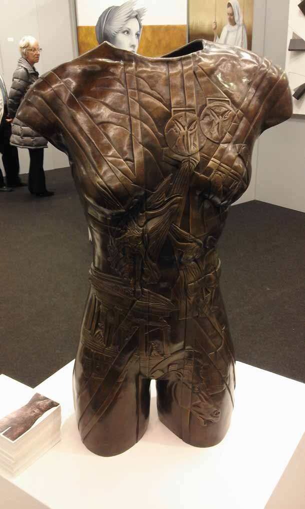 Tra tante pitture ecco emergere una scultrice, l’inglese Louise Giblin, Body Cest Sculptor, membro della Royal British Society of Sculptor. Nel suo bronzo, Olympian IV, il corpo della dea è attraversato dalla bandiera inglese (un originale contributo autobiografico) alla quale si sovrappongono, resi con preziosa cesellatura, quei chiari riferimenti alla classicità greca, all’età dell’oro della Polis di Pericle, dai templi alla Nike, l’alata dea della vittoria. A quest’ultima e al suo volo si lega il dorso della scultura: un corpo intagliato di farfalla, che conferisce leggerezza al capolavoro bronzeo.