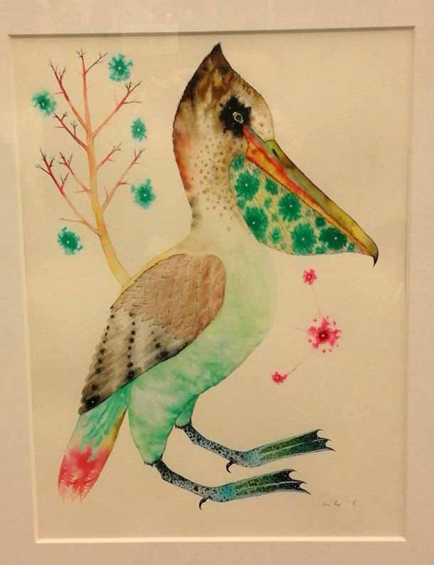 Fantasia surreale e realtà, natura animale e natura vegetale, invenzione e tradizione “bestiari medievali” sono gli ingredienti dell’opera del giovanissimo artista italiano, nato in Toscana a Figline Valdarno, Nilo Australi, l’Animale fantastico. Un animale somigliante ad un pellicano, elaborato con tecnica mista, disegno e acquerello, che sembra, nell’uso dei colori, trasporsi e metamorfizzarsi in albero, con le radici-zampe pinnate immerse nell’acqua. Ala e testa, curate nei minimi dettagli, sembrano dannunzianamente diventare tronco, il busto e, soprattutto, il becco, richiamano alla folta chioma della quale possono contarsi le innumerevoli foglie. Una fantasia “panica” che si fa unica, come la sua originale creazione.