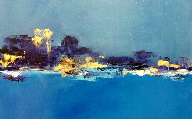 Il blu è il tono dominante del trittico dell’artista americana B’Beth Weldon. Mare e cielo si intersecano coloristicamente, divisi da una Polis nella quale dominano sovrapposizioni di blu scuri e gialli, resi con pennellate ricche di materia, dall’oscurità della Polis escono quei tocchi di luce bianco-giallastri che si riflettono, astrattamente, sulla superficie dell’acqua dell’oceano, Capturing the Essence of the Moment, come affermato nel titolo.