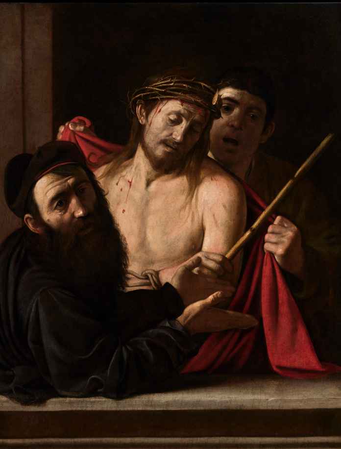 Ai lati San Giovanni Battista, San Francesco in meditazione, Davide con la testa di Golia e ancora Cristo, ma nella più serena atmosfera della Cena di Emmaus. E c’è un’opera che per le sue minori dimensioni potrebbe rischiare di attirare meno l’attenzione, e che è invece protagonista d’eccezione di questa mostra: l’Ecce Homo, rinvenuta e attribuita a Caravaggio solo nel 2021. Queste opere a tema sacro appartengono al periodo a cavallo tra Roma e Napoli, quando cioè il nostro deve scappare dalla capitale per aver ucciso in una rissa Ranuccio Tomassoni, altra testa calda che scorrazza in città.