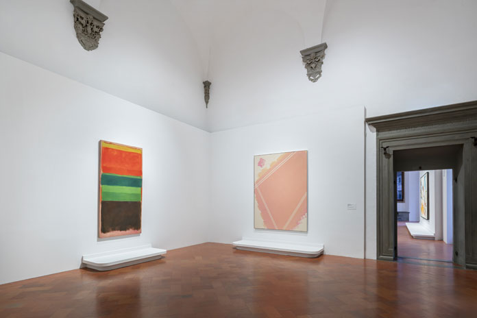 Il percorso espositivo di Palazzo Strozzi è volutamente essenziale, permettendo alle opere di dominare lo spazio. Il minimalismo dell’allestimento sottolinea l’impatto visivo delle grandi tele, che spaziano da tonalità delicate e eteree a colori vibranti e decisi. Tra le opere in mostra, spicca “Mountains and Sea” (1952), considerata una delle opere fondamentali di Frankenthaler, che ha segnato l’inizio del suo approccio innovativo al colore.