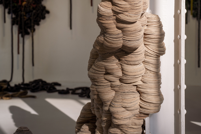 La percezione muta con la distanza, in una sorta di camouflage percettivo: ciò che da lontano sembra spugna, vello o calcare marino, da vicino rivela i reali materiali di cui è composto e la precisione quasi ossessiva del gesto manuale che li ha assemblati. In questa oscillazione tra naturale e artificiale, tra organico e inorganico, emerge il nucleo poetico del lavoro di Soal: un equilibrio fragile tra inquietudine e serenità. Inquietudine per la vitalità ambigua e imprevedibile della materia e serenità per la possibilità, sempre presente, di una rigenerazione.