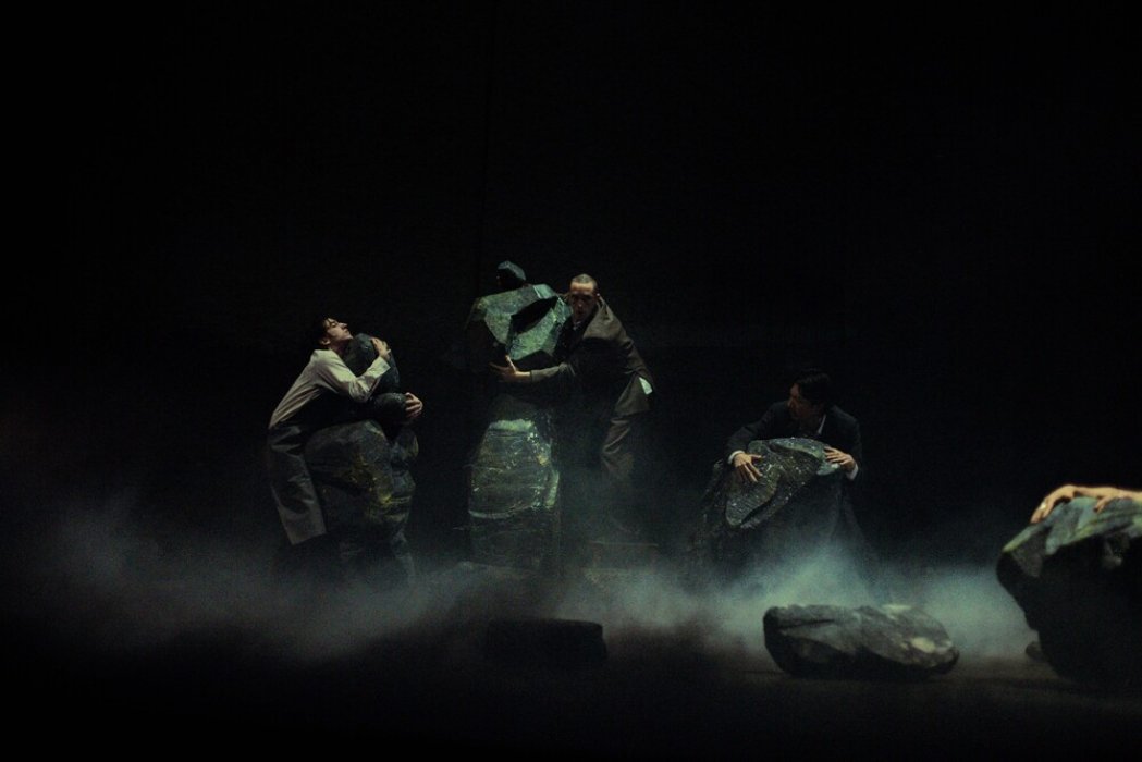 Cinque uomini sono come intrappolati in una sequenza di scene: i loro movimenti sono straordinari, nel senso proprio di “fuori dall’ordinario”. Subiscono scosse sismiche, rispondono a eventi meteorologici e a mutazioni, reagiscono – quasi – a repentini cambi di gravità o materia, rimbalzando come fatti di gomma sul pavimento scenico.