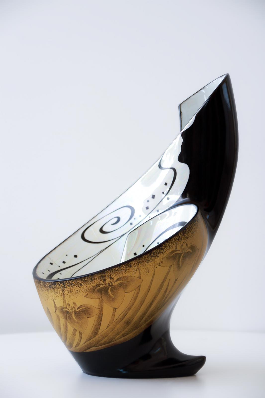 Un’arte antica, delicata, di alta artigianalità che ha portato l’artista a scegliere di decorare la porcellana con “polvere d’oro antico giapponese”, che ne caratterizza tutta la sua produzione, tanto da definirla unica nel suo genere. Oro antico su fondo bianco o su fondo nero che ritroviamo nelle decorazioni dei preziosi complementi di arredo, tra i quali spiccano vasi e piatti ornamentali e nella minuziose e raffinate creazione di splendidi gioielli, tra i quali spiccano gli originalissimi pendenti.