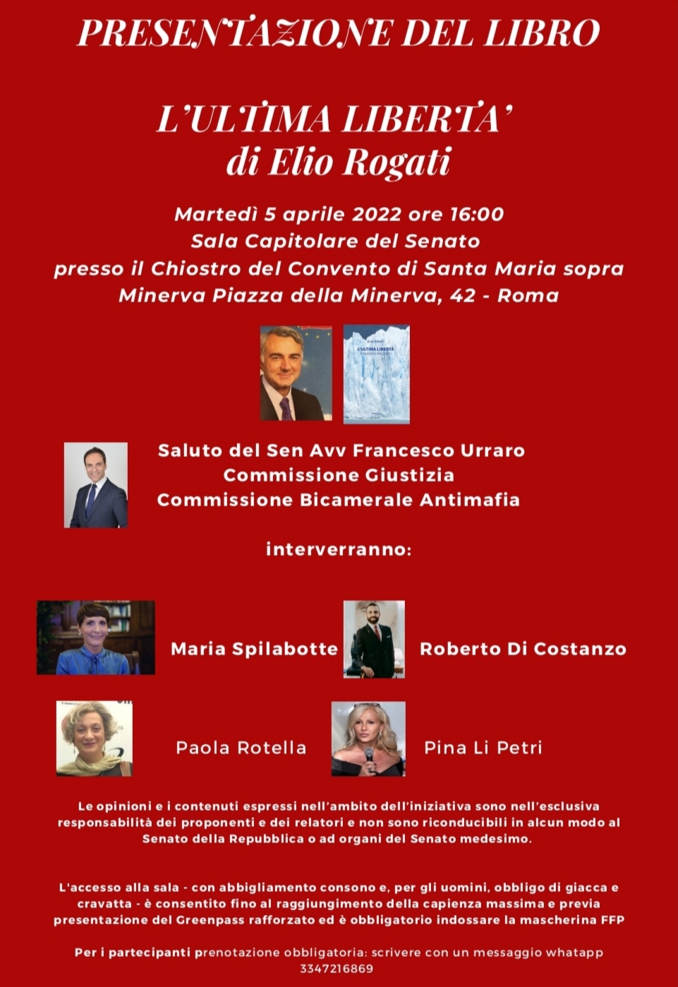 Il prossimo 5 aprile alle ore 16.00, nella prestigiosa Sala Capitolare del Senato presso il Chiostro del Convento di Santa Maria sopra Minerva a Piazza della Minerva, 42 in Roma, verrà presentata l’ultima opera letteraria del professore e giornalista Elio Rogati, il romanzo “L’Ultima Libertà”, edito dal Gruppo Albatros.