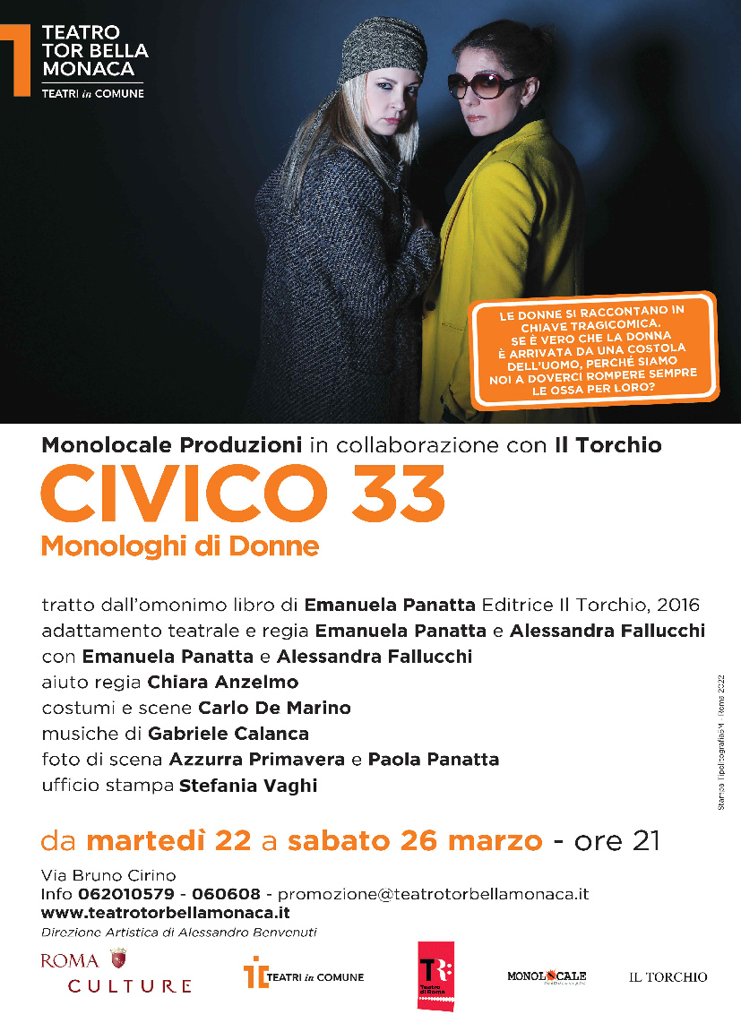 In scena al Teatro Tor Bella Monaca dal 22 al 26 marzo 2022 “CIVICO 33 Monologhi di Donne”, tratto dall’omonimo libro di Emanuela Panatta che ne ha curato l’adattamento teatrale e la regia insieme ad Alessandra Fallucchi, uno spettacolo prodotto da Monolocale Produzioni in collaborazione con Editrice Il Torchio.