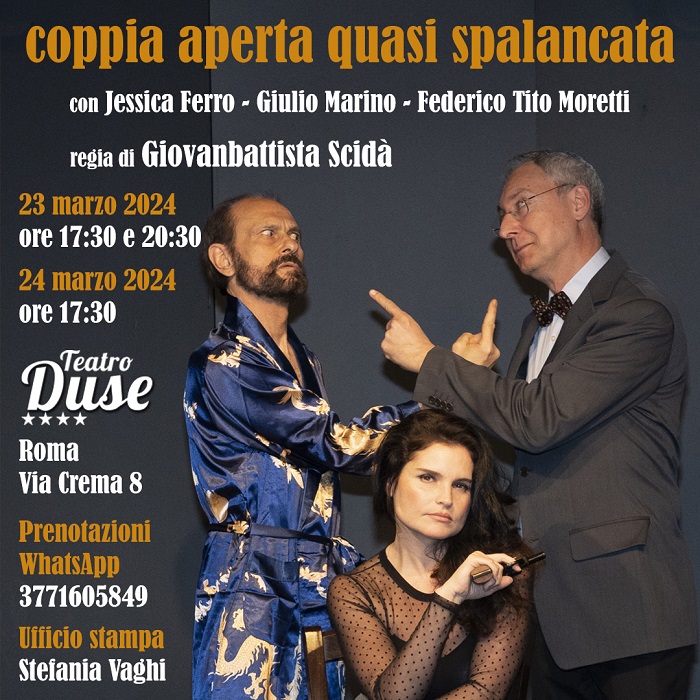 Andrà in scena i prossimi 23 e 24 marzo 2024 al Teatro Duse a Via Crema 8 a Roma “Coppia aperta quasi spalancata” di Dario Fo e Franca Roma, regia di Giovambattista Scidà, con Jessica Ferro, Giulio Marino e Federico Tito Moretti.