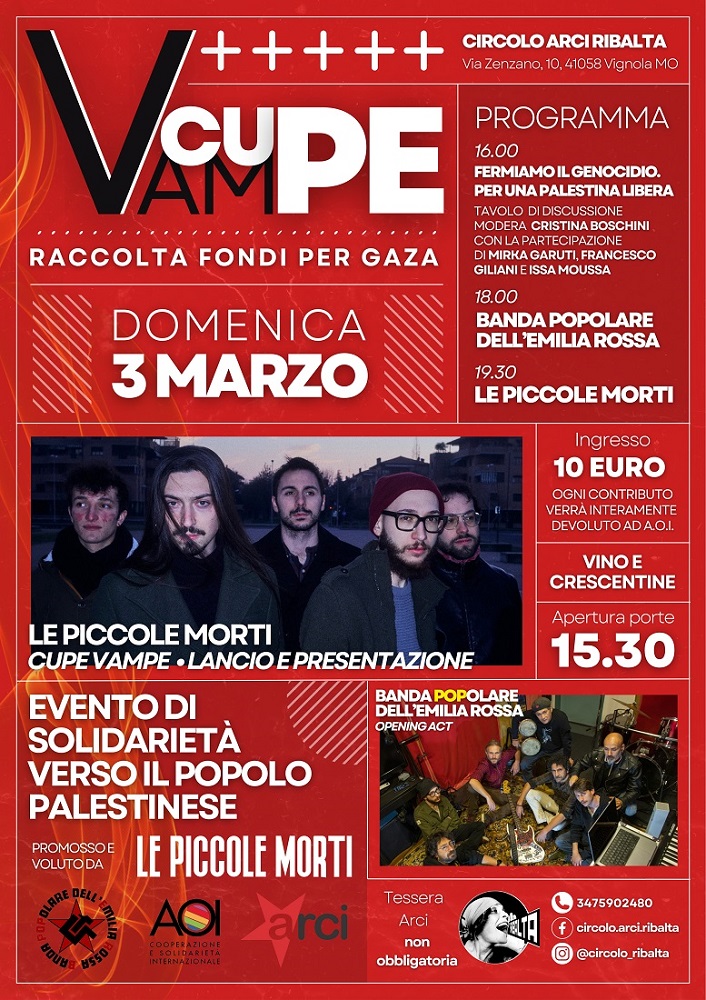 La band modenese de Le Piccole Morti in collaborazione con il Circolo Arci Ribalta e la Banda Popolare dell’Emilia Rossa presentano il concerto-evento: “Cupe Vampe – Raccolta fondi per Gaza”, giornata di solidarietà verso il popolo palestinese, il prossimo 3 marzo 2024 presso il Circolo Arci Ribalta in via Zenzano 10 a Vignola in provincia di Modena.