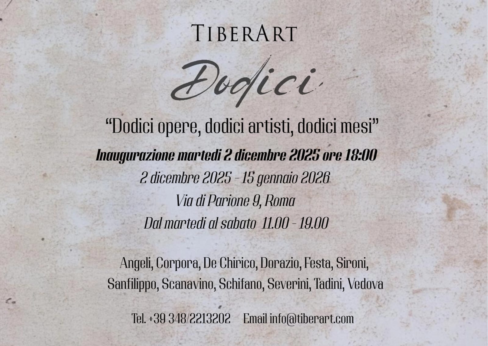 La Galleria Tiber Art è lieta di annunciare l’inaugurazione della mostra collettiva “DODICI – Dodici opere, dodici artisti, dodici mesi”, che avrà luogo il 2 dicembre 2025 alle ore 18:00,