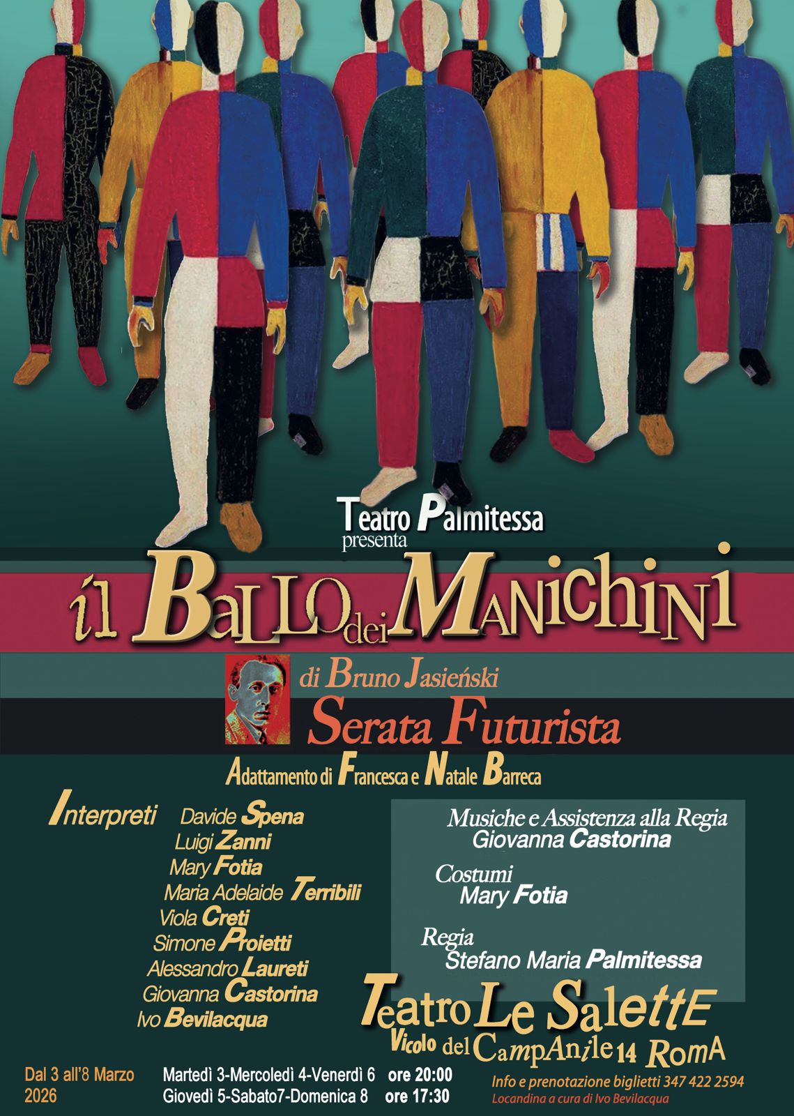 Andrà in scena al Teatro Le Salette di Roma dal 3 all’8 marzo 2026, l’opera futurista di Bruno Jasienski “Il ballo dei Manichini”, adattamento di Francesca e Natale Barreca, regia di Stefano Maria Palmitessa.