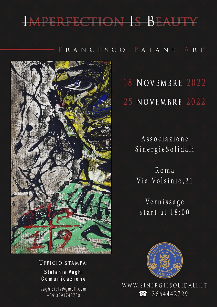 Francesco Patanè, artista siciliano di origini, romano di adozione, presenta la sua prima personale a Roma “Imperfection Is Beauty” dal 18 novembre al 25 novembre 2022, all’Associazione SinergieSolidali a Via Volsinio 21, nel quartiere Trieste.