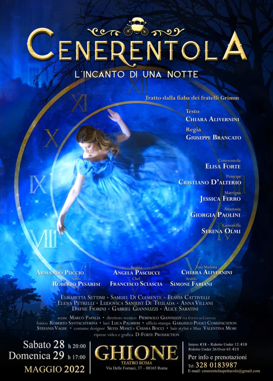 Tratto dalla favola dei fratelli Grimm per eccellenza “Cenerentola, l’incanto di una notte” sarà in scena al Teatro Ghione, di via delle Fornaci, i prossimi 28 e 29 maggio, scritto da Chiara Alivernini con la regia di Giuseppe Brancato, assistente alla regia Fabrizia Sorrentino.