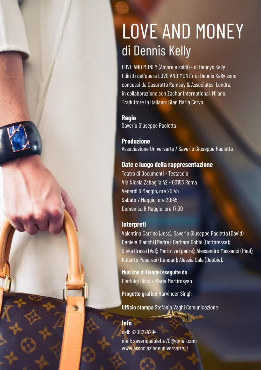 Andrà in scena i prossimi 6, 7 e 8 maggio al Teatro di Documenti di Testaccio la pièce teatrale “Love and Money” di Dennis Kelly, con la regia di Saverio Giuseppe Paoletta, nella sua triplice veste di regista, produttore ed attore, e la produzione di Associazione Universarte.