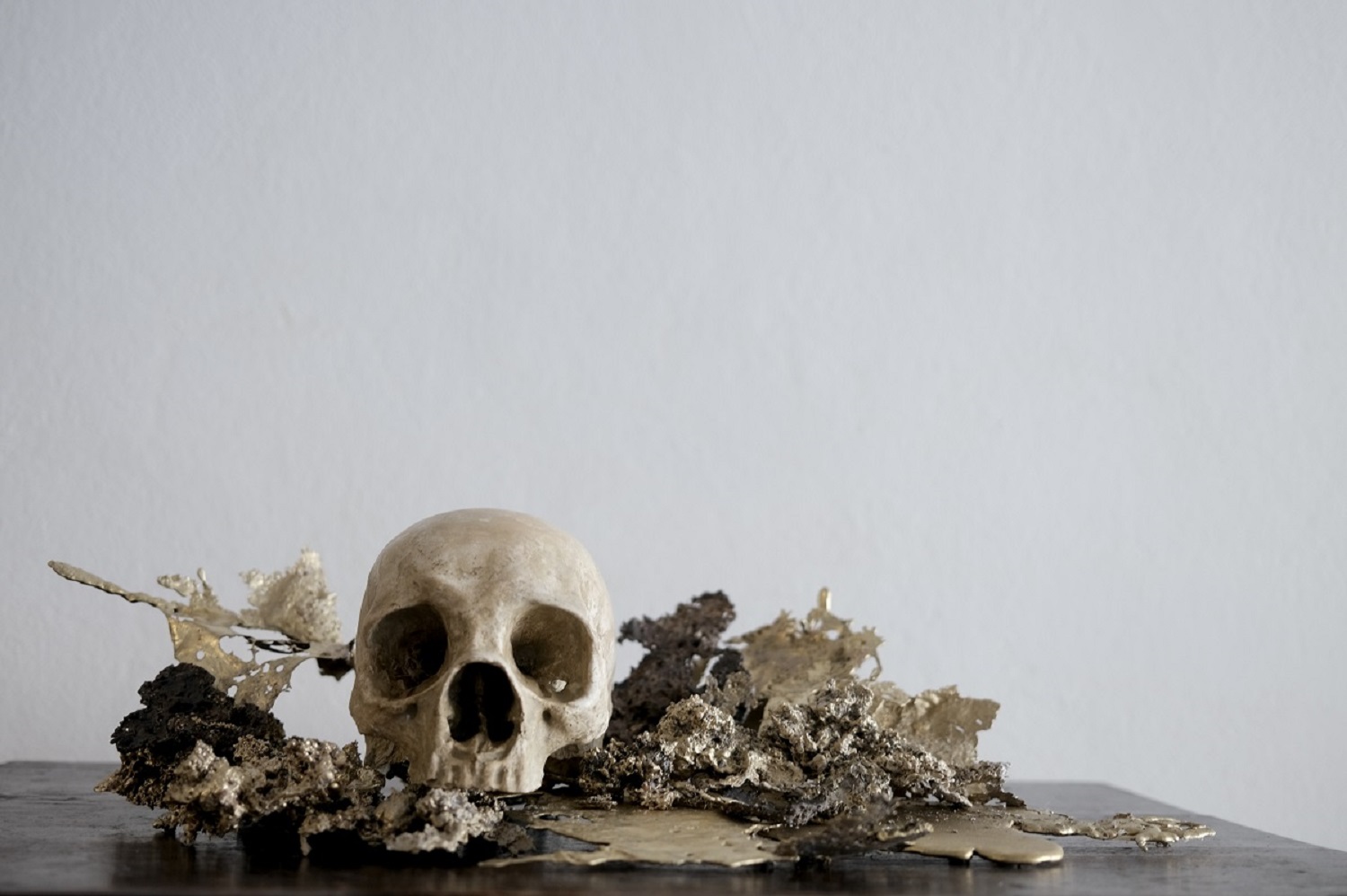 L’artista, nella sua continua ricerca artistica sulla reliquia e sugli ex voto, presenta una nuova serie di opere: quattro sculture in bronzo patinate, due teschi e due femori, con delle sovrapposizioni ed interventi in ulteriori metalli, dall’ottone al bronzo bianco nonché delle installazioni con dei teschi in gesso bianco patinato, decorati con scorie e “bave” di bronzo e di ottone, così da voler ricreare una vera e propria Wunderkammer (“Stanza delle meraviglie”), un richiamo all’estetica molto in voga nel ‘700.