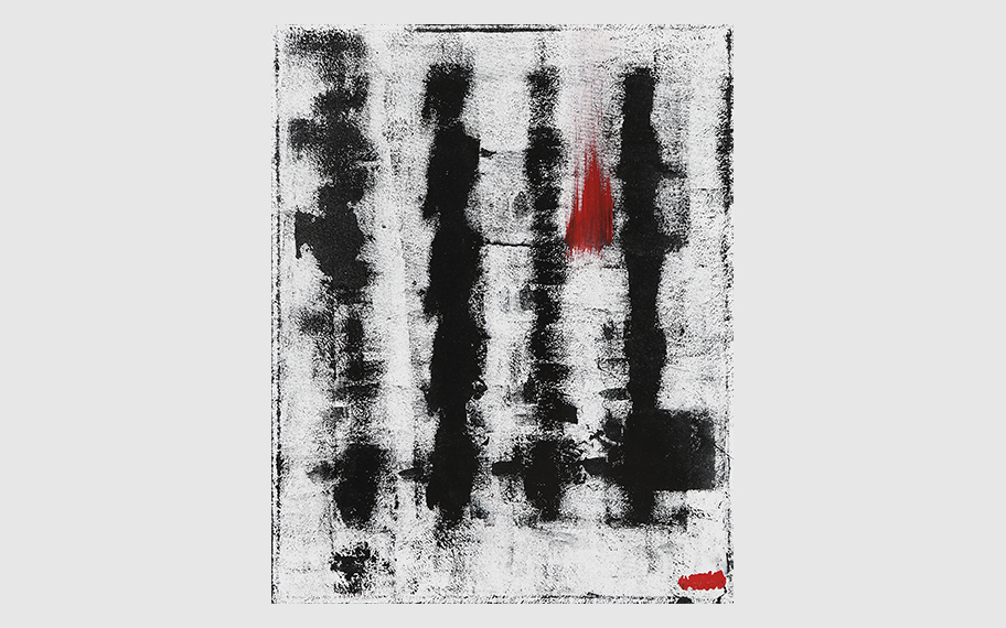 La serie diventa come un filo invisibile che avvolge e unisce le persone che hanno incrociato il suo cammino, ricordate con un’impronta rossa sulla tela.