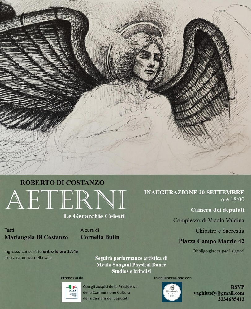 Inaugurerà al pubblico il prossimo 20 settembre l’esposizione “Aeterni – Le gerarchie celesti” dell’artista, pittore, ritrattista, Roberto Di Costanzo, a cura di Cornelia Bujin, promossa da ICAS Intergruppo Parlamentare “Cultura, Arte, Sport” di cui l’Onorevole Federico Mollicone è fondatore e coordinatore con gli auspici della Presidenza della Commissione Cultura della Camera dei deputati, e realizzata in collaborazione con Roberto Di Costanzo Home Gallery in Roma.