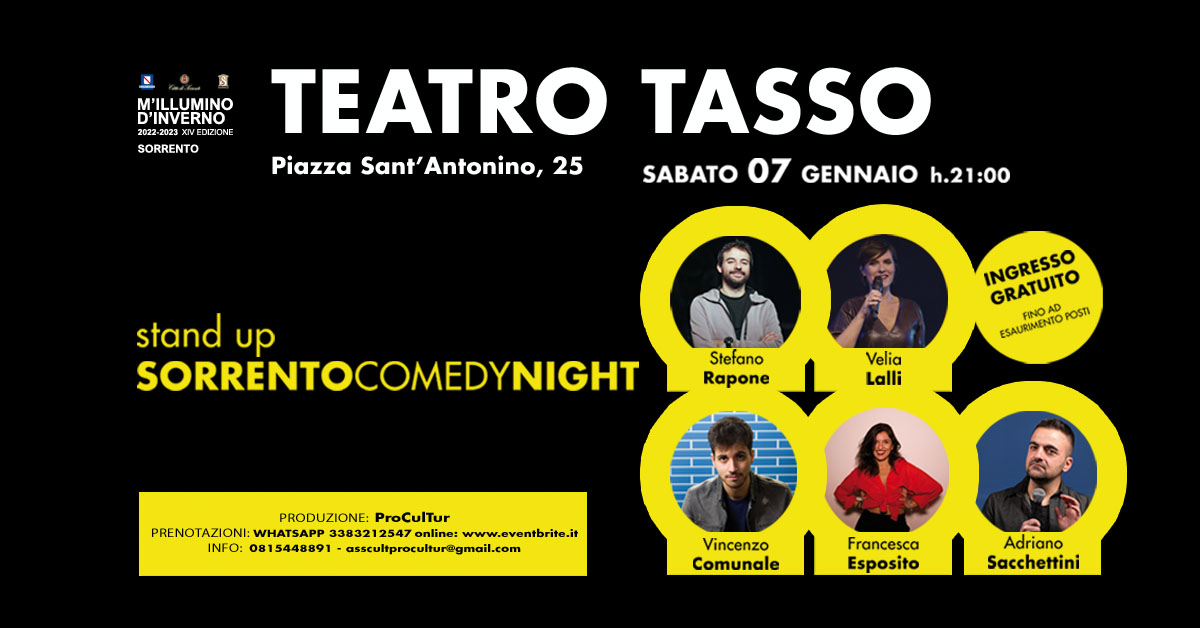 Live show SORRENTO COMEDY NIGHT – stand up Stefano Rapone Velia Lalli Vincenzo Comunale Francesca Esposito Adriano Sacchettini STEFANO RAPONE Stefano Rapone è uno stand up comedian italiano. Collabora come autore con il