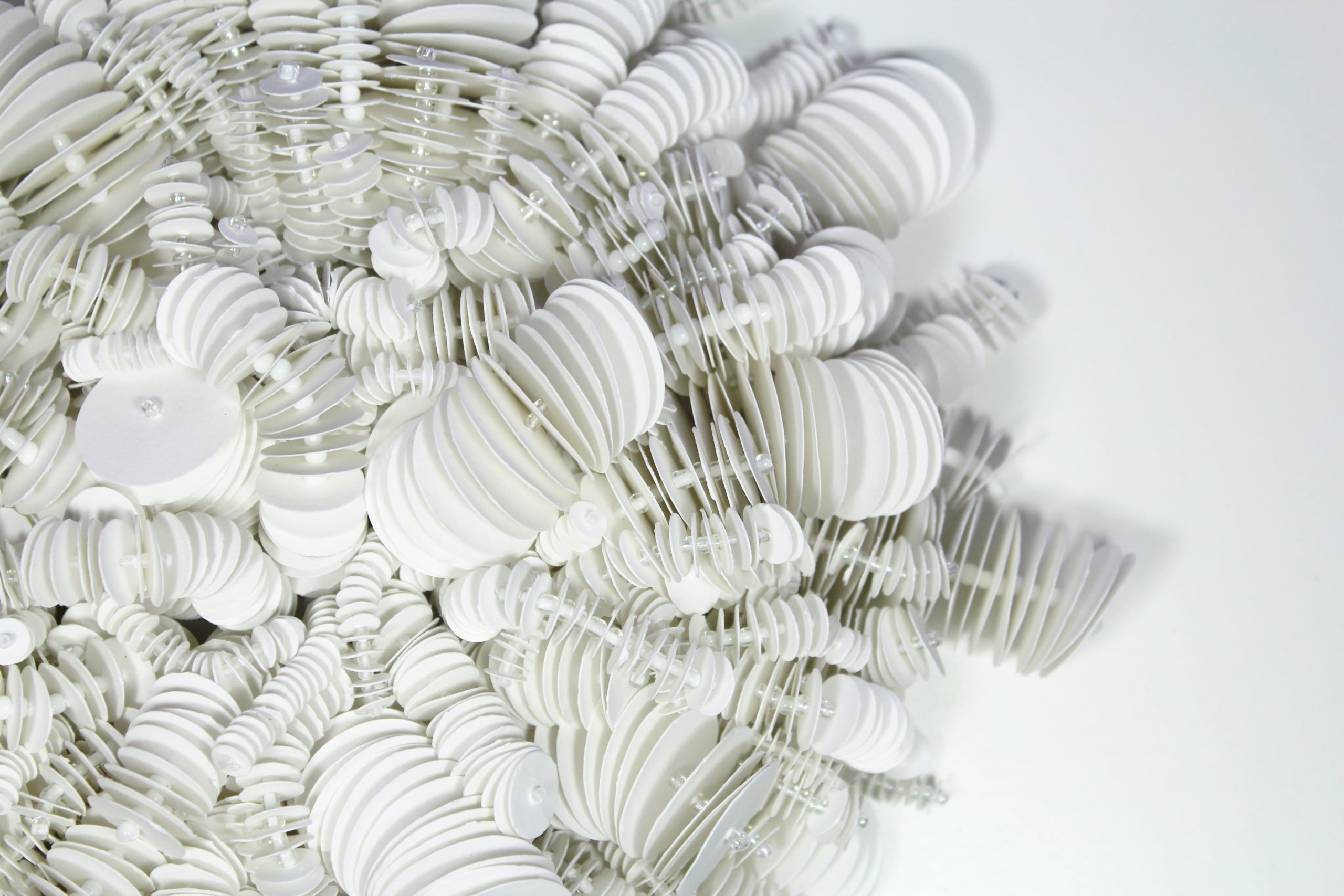 Dare corpo al ricamo, trovargli una sua nuova connotazione nello spazio, attraverso la profondità, in un significato nuovo di essere “materiale”.