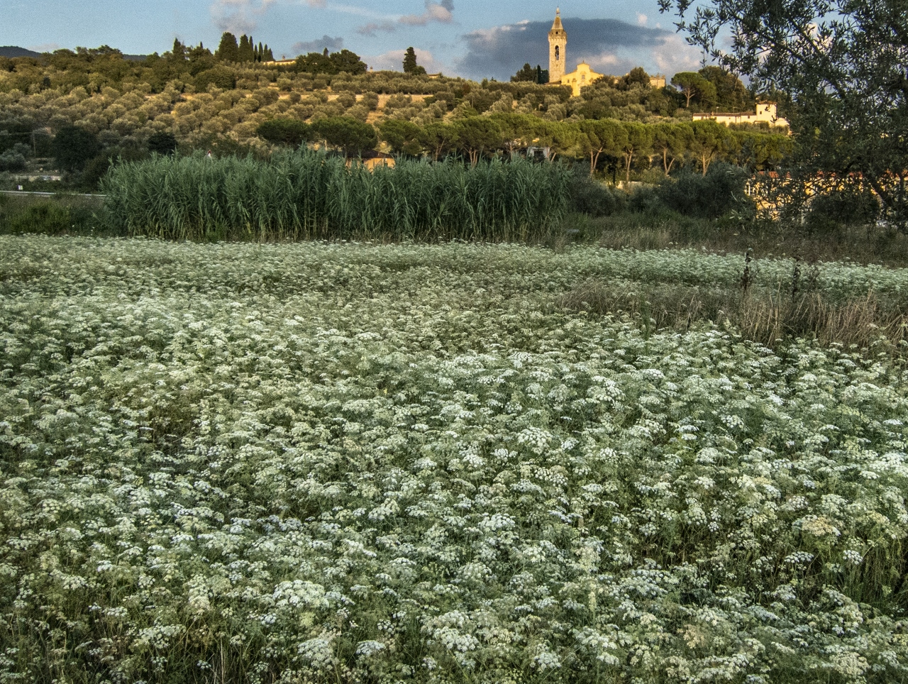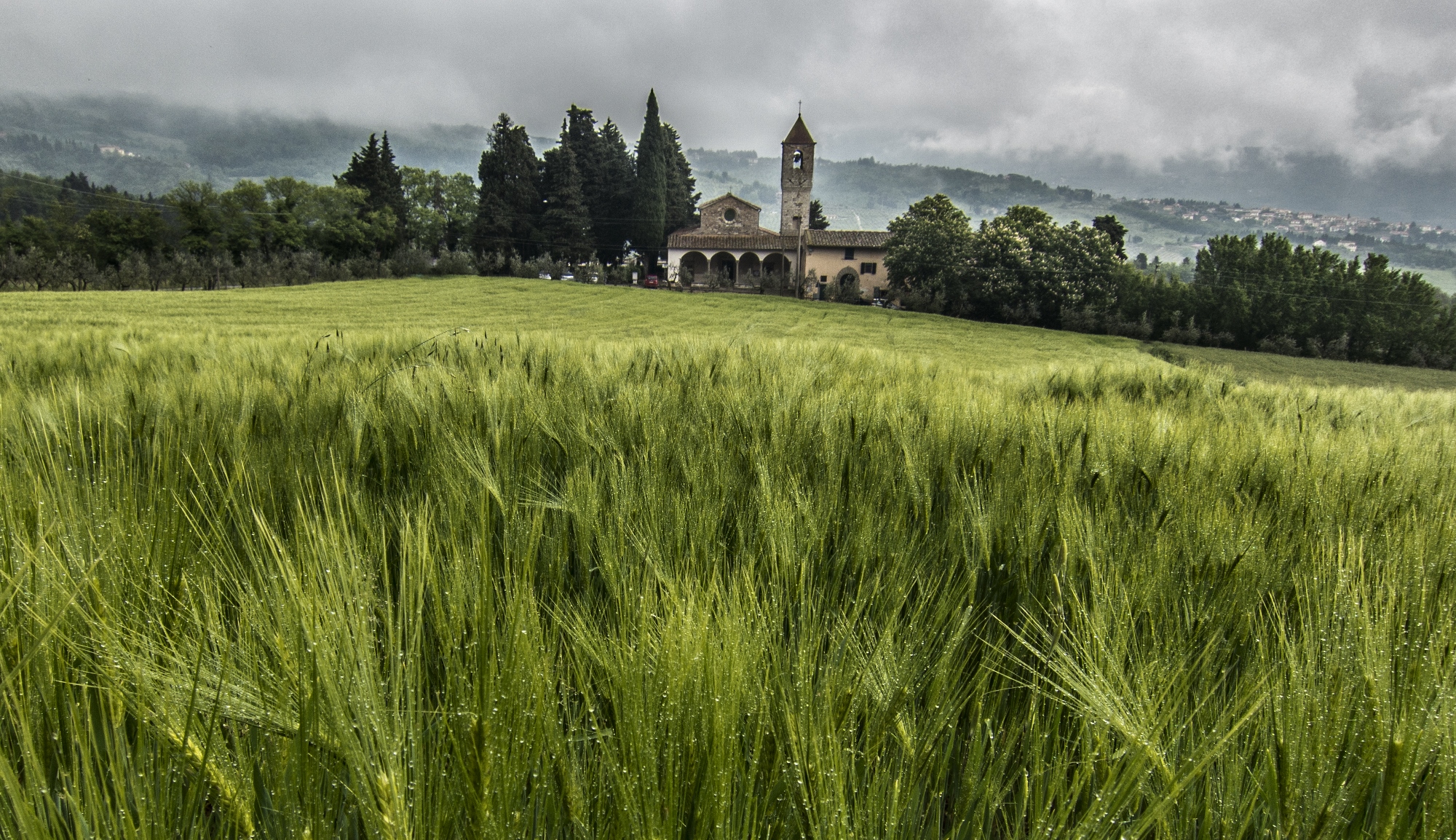 La Pieve di Sant’Andrea a Cercina domina un tappeto di rigoglioso frumento.