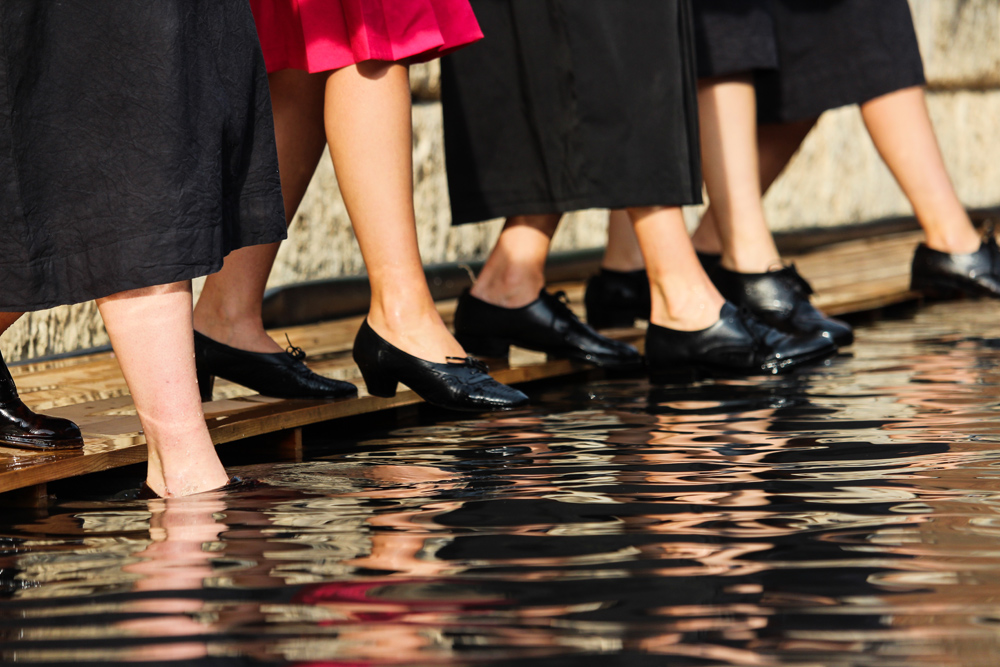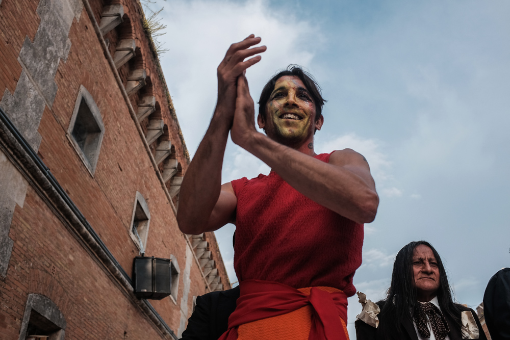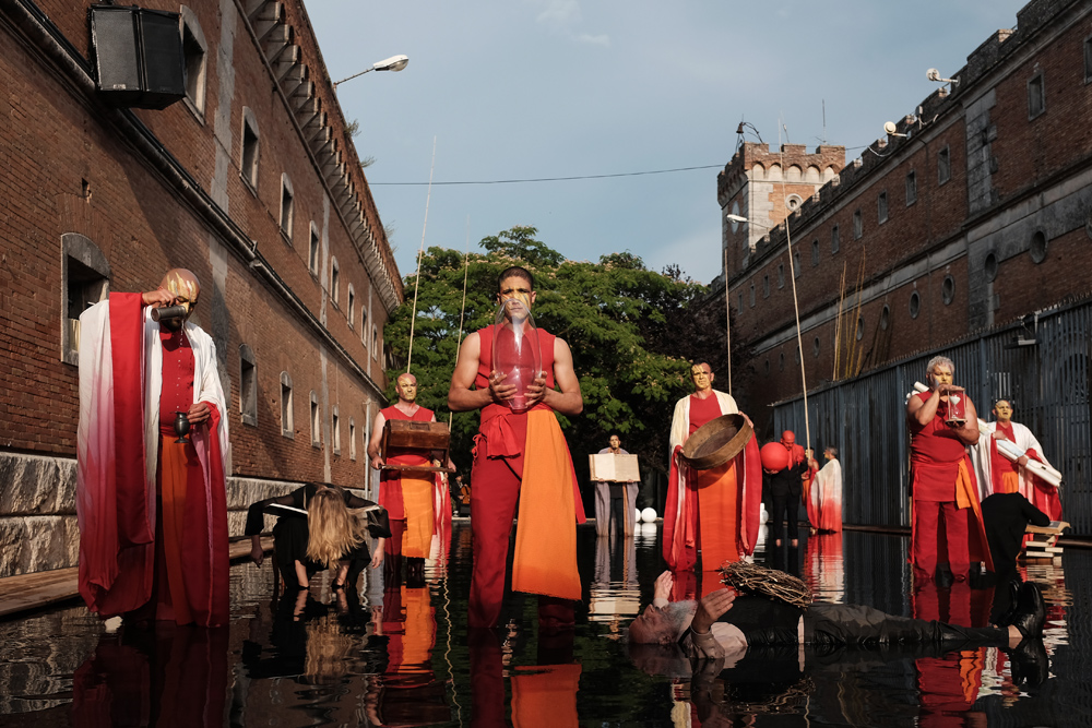 La Compagnia della Fortezza di Volterra festeggia i suoi 30 anni con il nuovo spettacolo Beatitudo, frutto di due anni di lavoro su testi di Jorge Luis Borges, creato dalla mente geniale e visionaria di Armando Punzo. Una genialità che si sposa con un pizzico di follia e con l’immensa vasca ricolma d’acqua che occupa l’intera scena, ossia il campo da calcetto dei detenuti del Carcere di Volterra. Le barriere sono abbattute, ed in un flusso onirico inizia il viaggio labirintico tra le parole di Borges ed i suoi personaggi lievi e poetici, che danzano riflessi sullo specchio incrinato dell’acqua. Le note cariche di pathos dell’eclettico polistrumentista e compositore Andrea Salvadori rendono i tableaux vivants ancor più ammalianti e introspettivi, e guidano lo spettatore verso dimensioni altre e corroboranti.