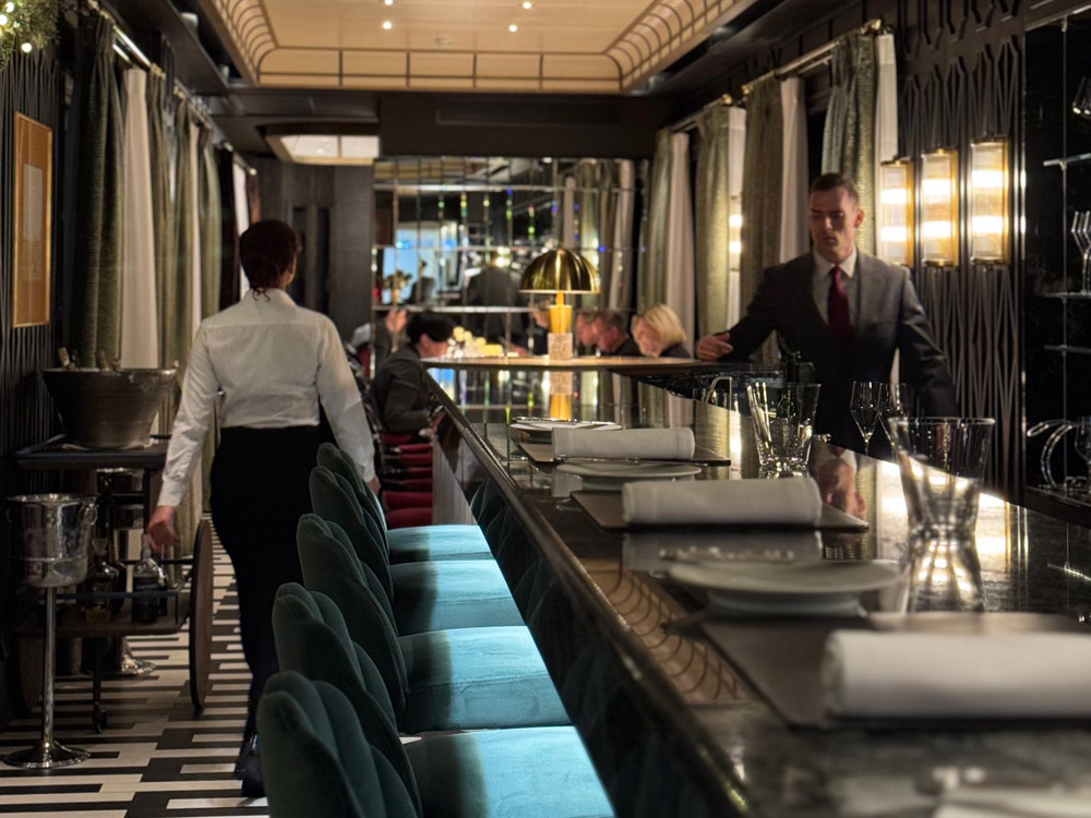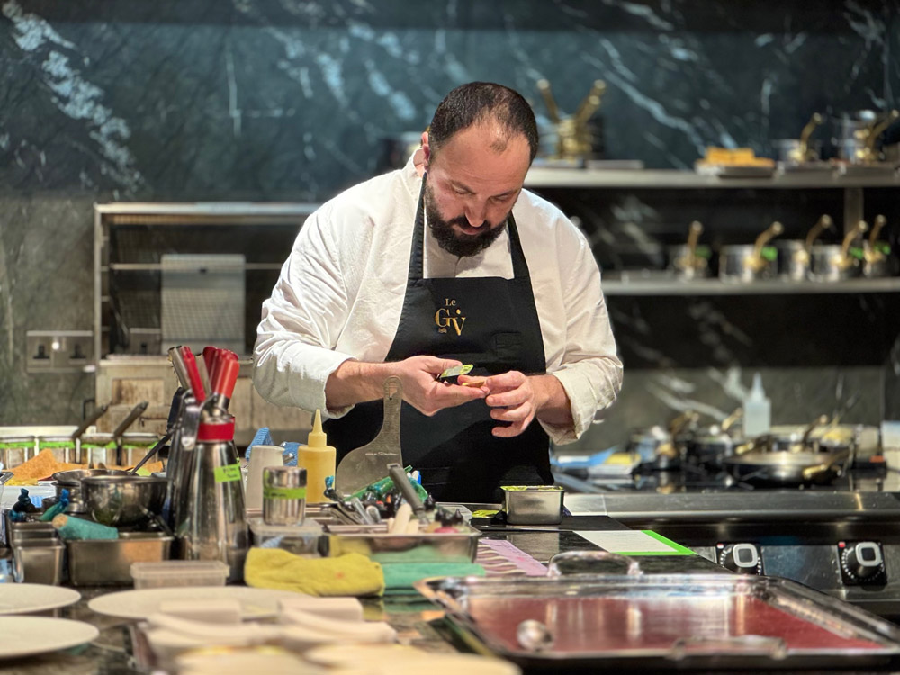 Sul rooftop di Le GV, ristorante una stella Michelin nel cuore di Malta, all’undicesimo piano dell’hotel Le Soleil del 1926, la vista sul Mediterraneo di Sliema accompagna un’esperienza che punta sia sulla costruzione del gusto che sull’effetto scenografico. L’ambiente, cucina a vista, servizio attento, ritmo ben scandito, arredamento elegante ispirato alle carrozze dell’Orient Express, è il contesto ideale per una proposta che fonde radici mediterranee, formazione francese e aperture verso l’Oriente, con un’attenzione particolare al tema degli abbinamenti, sia alcolici che analcolici, curati dall’head sommelier Brayan Oliveira. All’attenta regia lo chef Andrew Borg e il pastry chef David Tanti, coadiuvati dalla precisione sartoriale della brigata con Andrea Amore sous-chef.