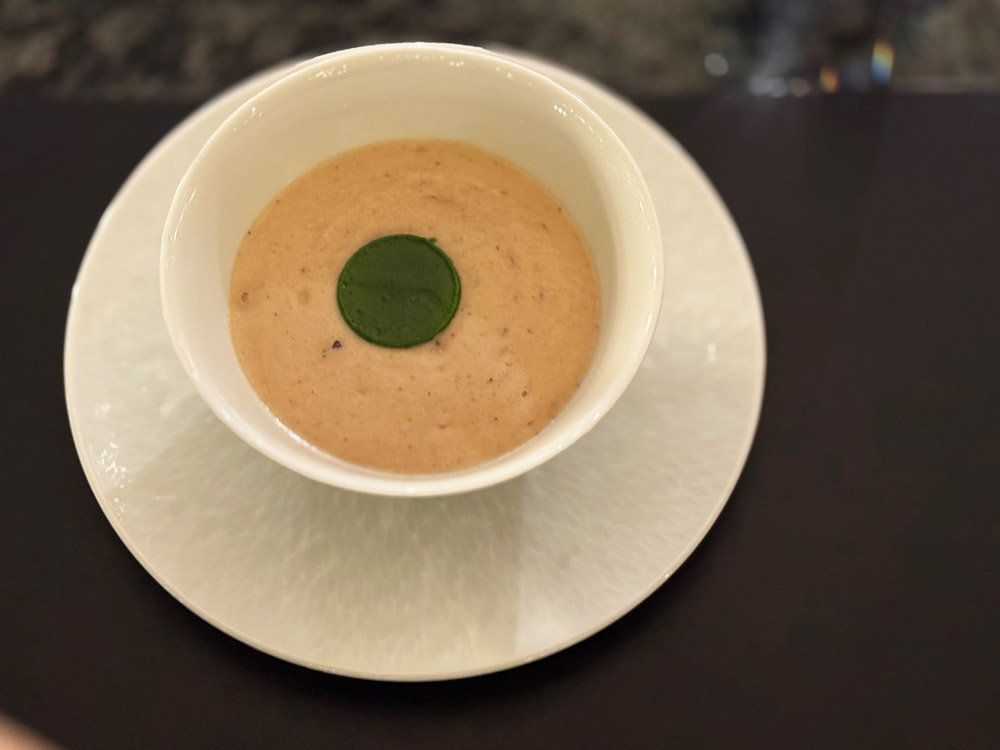 La vellutata di castagne con olive verdi, datteri e burro alle erbe aggiunge una nota più profonda e rotonda, preparando a una progressione gustativa costruita per contrasti e ritorni.
