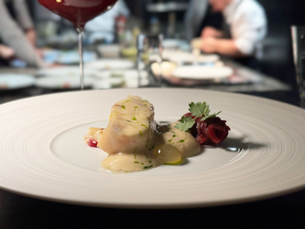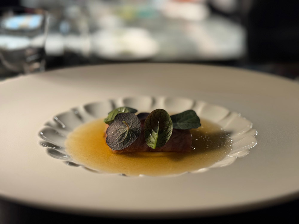 Tra i piatti più centrati, il wagyu giapponese crudo con cavolo, pinoli, ostriche e dashi caldo: materia prima di grande qualità e un equilibrio riuscito tra grassezza, iodio e umami. L’abbinamento con il Tokara Blanc de Blancs Cap Classique 2016 del Sud Africa, teso e minerale, risulta efficace, mentre la proposta analcolica a base di rosa, lampone locale ed estratto di lievito dimostra come anche il pairing zero alcol possa lavorare su complessità e profondità, non solo su freschezza.