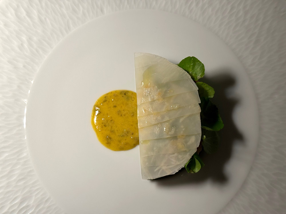 Un bicchiere di champagne Joseph Perrier apre la sequenza iniziale di canapés, prologo elegante della serata: il pane al vapore con melanzana e pomodoro lavora su dolcezza e acidità; la tartelletta di porro e shiso con lampuki affumicato introduce un dialogo tra erbe orientali e pesce locale; l’escabeche di cannolicchi con crema di rapa porta freschezza e precisione acida.