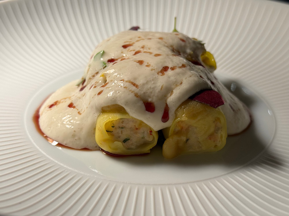 Con il cannellone di astice blu, indivia, zafferano iraniano e crema non pastorizzata, la cucina mostra il lato più classico e francese della propria identità: tecnica pulita, equilibrio tra dolcezza, amaro e spezia. L’Etna Bianco IDDA 2023 aggiunge tensione minerale, mentre l’abbinamento analcolico, carota antica, olivello spinoso e olio d’oliva Ta’ Betta, gioca con stile sulla grassezza vegetale e sulla componente agrumata.