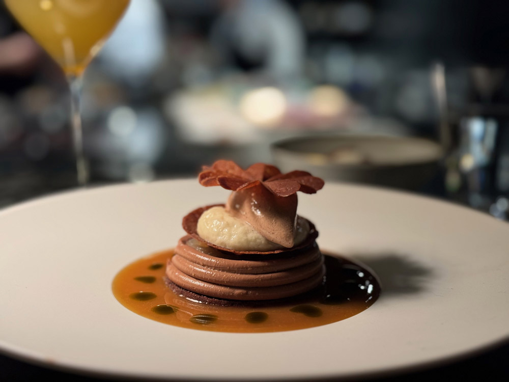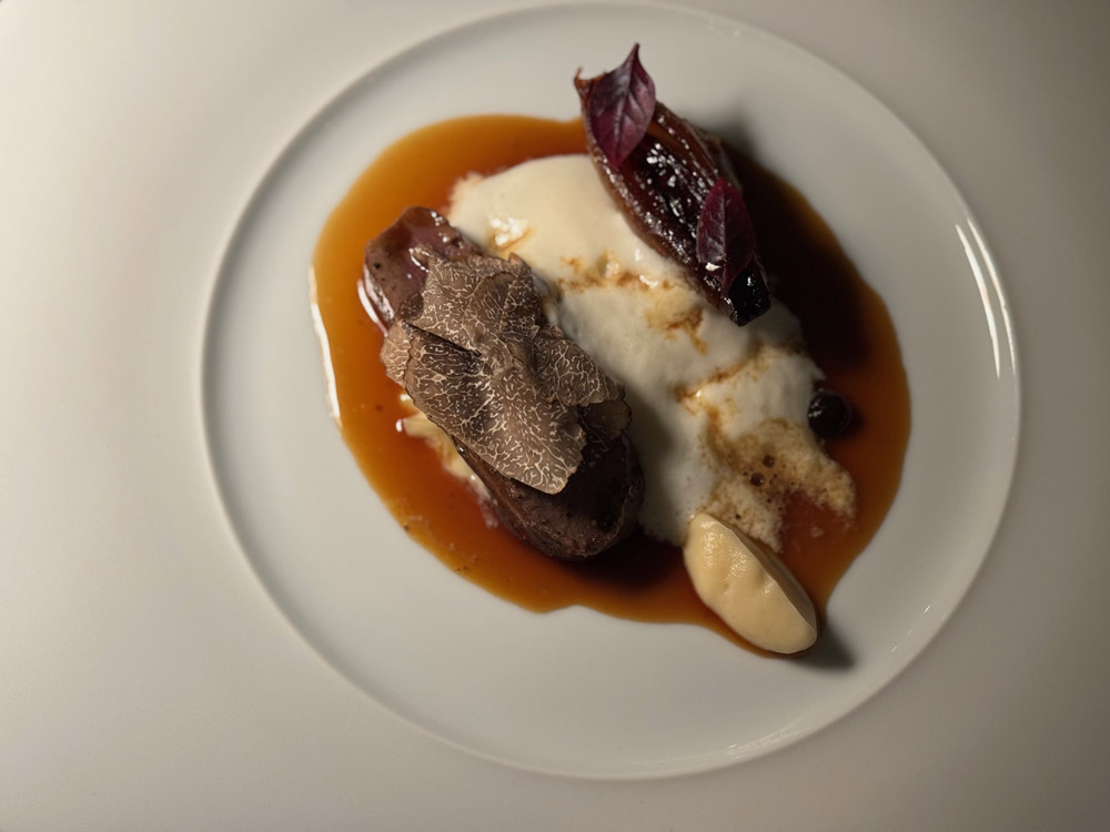 Il lombo di cervo con scalogno confit, bacon d’Alsazia, tartufo e salsa al burro di foie gras chiude la parte salata con una costruzione solida, intensa ma ben bilanciata. Il Terres Brûlées 2018 di Jean-Luc Colombo sostiene il piatto con spezia e profondità, mentre la versione zero alcol a base di barbabietola, pompelmo e burro nocciola riprende i toni dolci, amari e tostati in modo sorprendente.