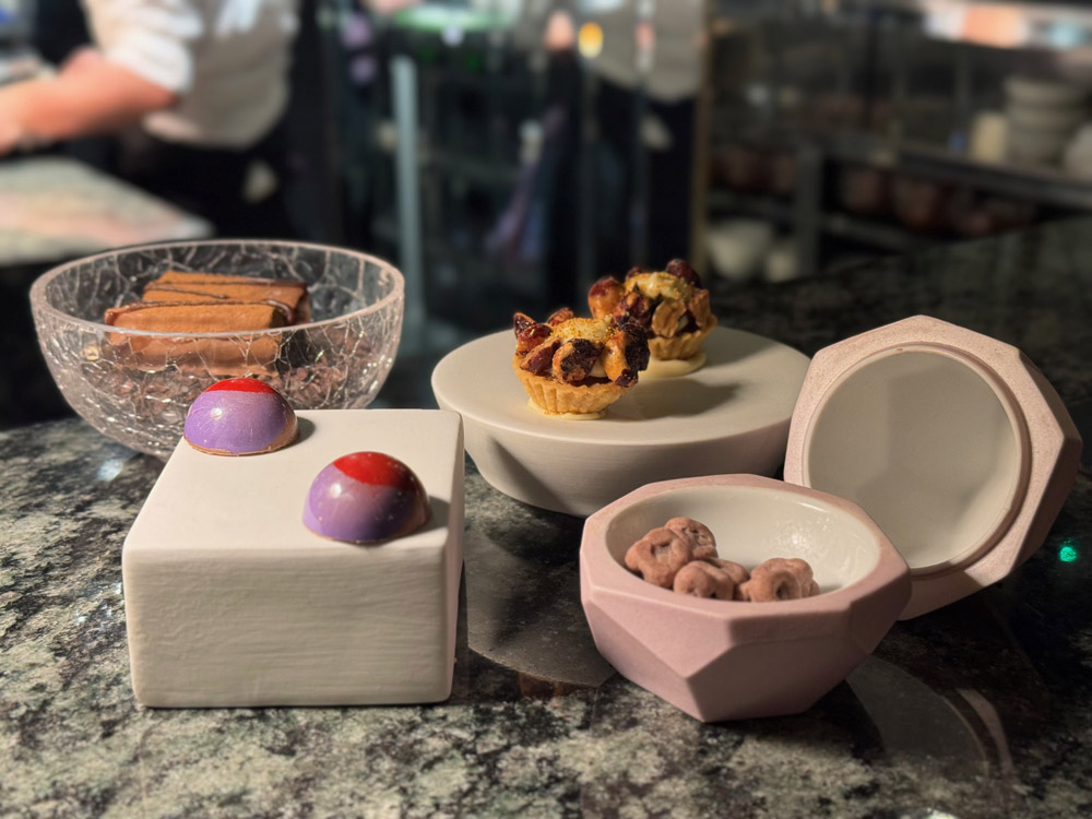 Il capitolo dolce, firmato da David Tanti, si muove tra precisione tecnica e gusto: la tartelletta al 70% con gelato al cacao nibs e tè Earl Grey gioca sull’amaro elegante; il clafoutis di kaki e lampone con gelato al whisky è più rotondo e avvolgente. Il Recioto della Valpolicella 2017 accompagna con coerenza, mentre mela e calendula, nell’abbinamento analcolico, chiudono in leggerezza floreale. Le mignardises, tra note di caffè, carrube e nocciole, terminano il viaggio in dolcezza.