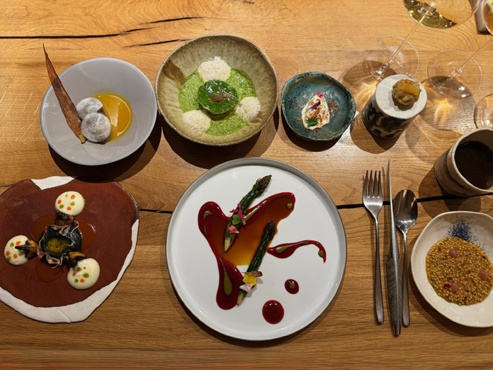Il finale dolce non cede alla prevedibilità. Si apre con gelato al wasabi e rafano, poi carote e zenzero, piselli-verde pompelmo, condimento allo zenzero, mousse di pastinaca; patata dolce, mango, datteri, acqua di maggiorana; crema di banana, riso soffiato, arachidi caramellate, kumquat; un pudding al gravy con banana caramellata e tamarindo che è quasi un’ode alla memoria infantile. L’ultimo abbinamento è la Malvoisie Passerillée 2020 – Blard & Fils, con note di frutta secca e miele.