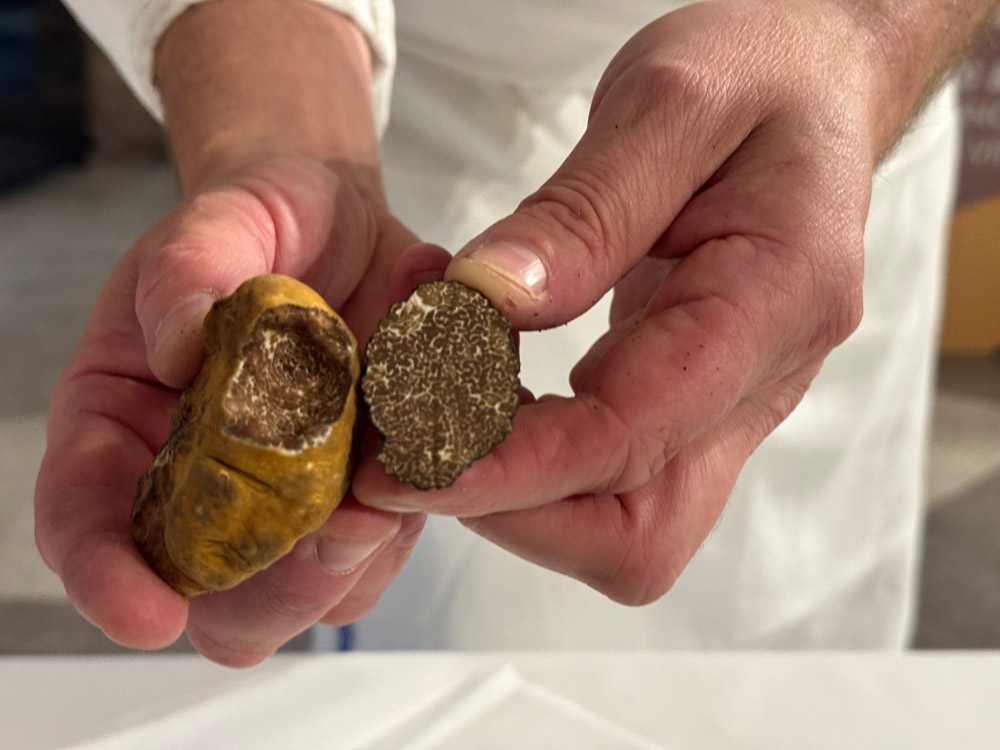 Durante la preparazione, Rossi ha anche offerto una breve lezione di riconoscimento del tartufo, raccontando aneddoti e segreti del mestiere, dal profumo della “marcia buona” alla consistenza perfetta del tubero.