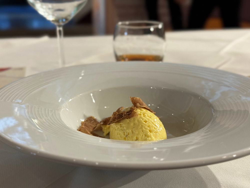 Il dessert, Tartucioccomousse di cioccolato bianco al tartufo bianco, ha stupito per delicatezza e misura. Il profumo del tartufo emerge in chiusura, regalando complessità senza dominare la dolcezza del cioccolato.