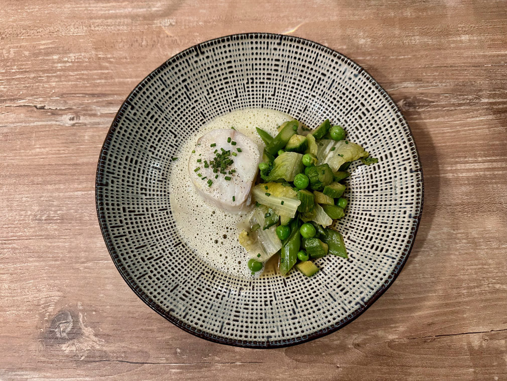 Il cuore del menu è il filetto di merluzzo cotto a bassa temperatura e servito con salsa bernese. Ad accompagnarlo, una composizione vegetale primaverile: asparagi, piselli, zucchine e taccole. Un gioco di consistenze e colori, dove la delicatezza del pesce trova contrappunto nella rotondità della salsa.