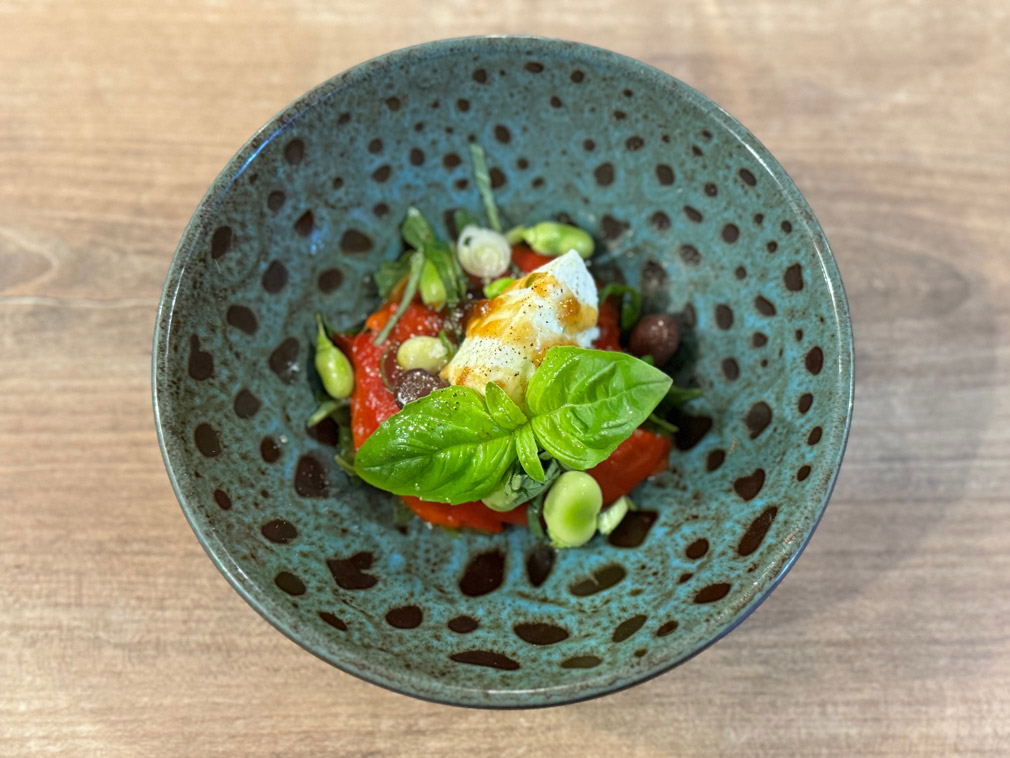 Il nostro percorso inizia con un brindisi: champagne e paté di olive, un’accoglienza semplice ma piena di carattere. Subito dopo, un antipasto vegetale: baccelli, formaggio di capra, peperone e basilico. Una combinazione di gusto e freschezza che richiama le campagne dell’entroterra provenzale.