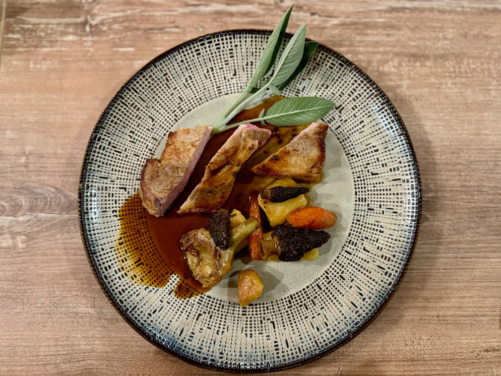 Segue un classico della casa: il foie gras marinato nel vino bianco, che lo chef serve inalterato da 25 anni. Il risultato è equilibrato, elegante, con una nota familiare. Anche qui lo Chardonnay del Mâcon continua ad accompagnare con grazia, sostenendo la morbidezza del foie gras senza sovrastarlo.