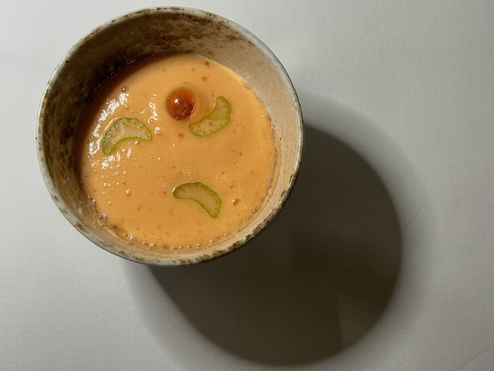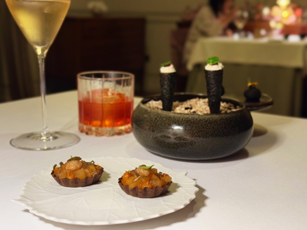 Interessante anche il lavoro sui cocktail di benvenuto, portati con un teatrale carrello e realizzati sul momento: su tutti il Negroni fermentato per tre settimane e poi affumicato è un esempio riuscito di come la mixology possa dialogare con la cucina senza sovrastarla, mentre lo Champagne Henri Giraud Esprit Nature di una maison con oltre 400 anni di storia accompagna l’inizio con una scelta più classica, ma coerente.