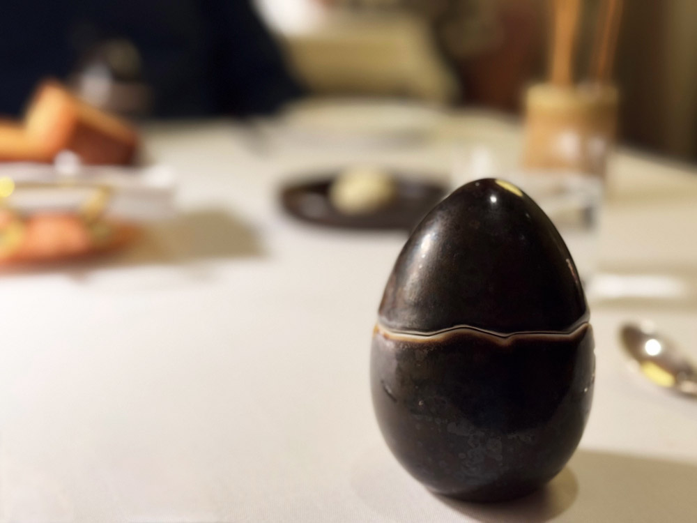 I petit fours, dal piggy face al cioccolato con polvere di prosciutto, alla panna cotta con cavolo e carrube, giocano con ironia, senza scadere nell’aneddotica.