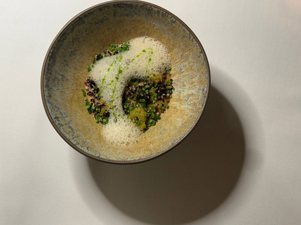 Il menu prosegue su una linea di contaminazione misurata. La Smoked Soy Chawanmushi con dashi foam, erba cipollina, gel di aglio nero e quinoa è un omaggio dichiarato alla cucina giapponese, risolto con eleganza e senza eccessi. Qui l’umami è il filo conduttore.
