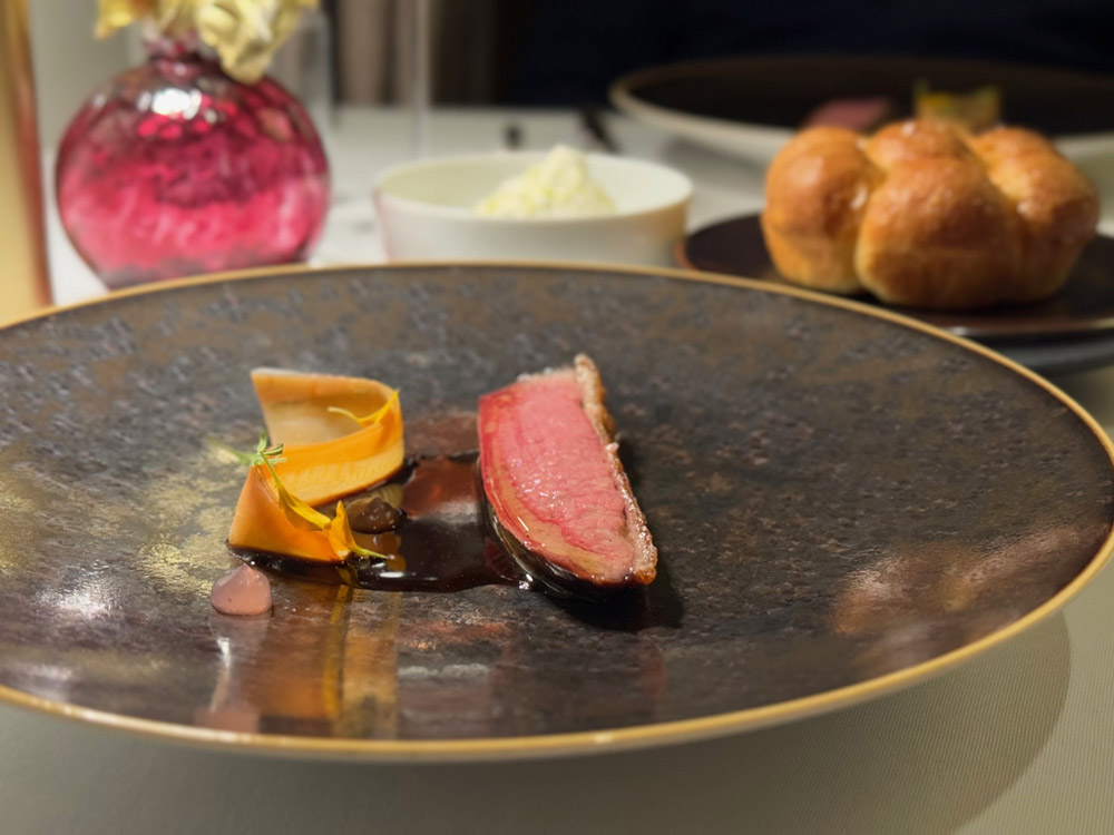 Di grande interesse anche il rosso Antonin riserva 2021, profondamente legato al territorio maltese. Un vino che cerca tensione, ideale per accompagnare l’anatra di Xemxija (isola a nord di Malta), servita con ceviche vegetale, brioche e schiuma di cocco e limone. Qui il sale di Gozo e il miele locale utilizzato per glassare il pane chiudono il cerchio territoriale.