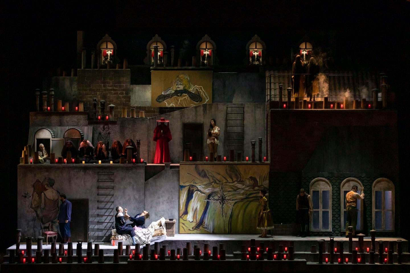 Così i dipinti di Toulouse-Lautrec lasciano cornice e tela per diventare – significativamente – murales, corpo unico con la città, street art, in qualche modo ad essa necessari come i mattoni e le tegole e i comignoli, da una parte due diversi ritratti tutto vezzi e tutto frode di Yvette Guilbert ossessione e musa ispiratrice come Musetta, dall’altra le Due donne seminude tragica testimonianza dello squallore del bordello: diventa graffito perfino, nell’Atto ultimo, il ritratto di Musetta uscito involontariamente dal pennello nostalgico di Marcello, significativamente il solipsista attimo d’intimità di Sola. Ma c’è anche, al centro della scena, la Cometa del Presepe a Betlemme di Banksy, breccia nel muro che divide la città, i buoni da una parte i cattivi dall’altra, i ricchi e i poveri, i sani e i malati, che diventa luce e annuncio di pace: altissimo momento di poesia che rimette insieme vari e sparsi brandelli d’umanità nella ritrovata unità donata dalla morte di Mimì, negli innumeri lumini accesi a simular la stelle, un cielo in terra, un cielo acquisito dalla città, Mimì che muore rende più luminosa la cometa sulla terra, perché la chiamano Mimì, ma il suo nome è Lucia, luce che torna luce, pensavate fosse un caso?