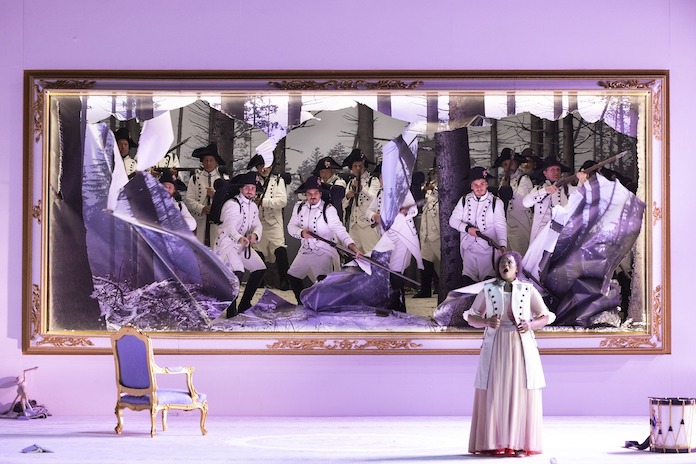 È un mondo dichiaratamente fittizio e teatrale, che porta in sé lo stigma della finzione ma non della falsità, fatto di improvvisati e ingannevoli palcoscenici dove è possibile desiderare e sperare, come in una favola, che i sogni diventino realtà ma continuamente, pervicacemente, insistentemente negando la propria essenza di imitazione del reale – lasciando che contadini impauriti ne rivelino fin da subito la vera natura, intrufolandosi al di sotto e a lato del fondale – per dichiarare, invece, la propria simulata sostanza, fino alla fine dell’atto, in cui, mentre Marie canta l’addio al suo mondo, si provvede a “ritagliare” la parte centrale del fondale.