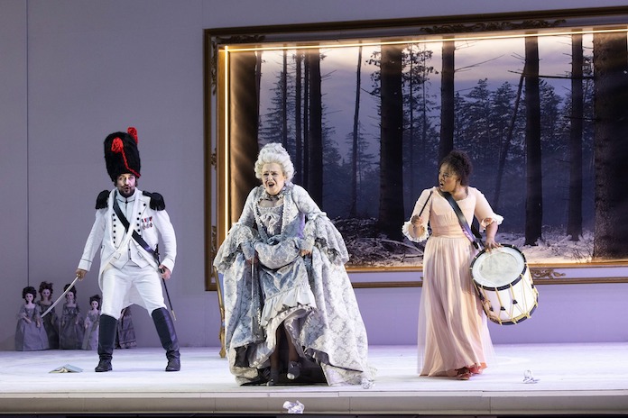 La genialità della trovata, in apparenza innocua e innocente, sta nel rendere più sottile ma più decisamente pervasivo e prorompente il tema, fondamentale nella piena cognizione dell’opera, del contrasto, voluto e necessario, tra autenticità della vita tra i numerosi “padri” di Marie, vista come sincera e genuinamente “borghese” e invece l’ipocrita “nobile” esistenza tra trine, parrucche e guardinfanti del Secolo dei lumi e dei cicisbei, per il nostro contemporaneo sentire di certo del tutto artificiosamente ricercata o quantomeno ambigua. Siamo ben lontani, dunque, dal mondo bonapartista del libretto, la Révolution è ancora di là da venire e non ci son di certo in giro sanculotti e giacobini, lo spostamento d’epoca della rappresentazione, spesso utilizzato dai registi contemporanei per render più comprensibile trame e tematiche, qui è usato proprio per questo dichiarato fine, pur se in senso inverso. Il che, detto fra noi e a bassa voce, porta anche con sé il non trascurabile effetto collaterale che potremmo chiamare di trompe-l’œil, d’illusione prospettica, che fa sì che chi, sulla sua poltroncina di velluto, guardi l’opera, non corra rischio di sentirsi offeso da provocanti oltraggi all’integrità librettesca come magari sarebbe successo portando la vicenda dichiaratamente ai giorni nostri: in tal modo la traduzione – il tradimento – c’è ma non si vede, almeno all’occhio superficiale di chi vede senza troppo guardare.