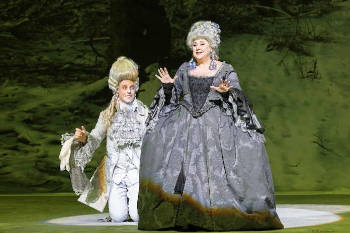 Michieletto ha così deciso che, diversamente dall’allestimento andato in scena al Bayerische Staatsoper, la Duchesse, fin dal primo atto, sostituisse ai dialoghi una narrazione riscritta alla bisogna in un approssimativo francese molto molto vicino alla lingua napoletana, con cui, in verità, ha ben più di un punto di contatto: al di là dell’effetto esilarante e della bontà dell’esito finale di tale scelta, su cui si può discutere, il risultato è che in tal modo l’idea registica di teatro nel teatro, di disinganno metatreatrale, viene di gran lunga rafforzata. Perché ciò che vediamo dipanarsi sulla scena non è più una semplice vicenda che prende forma sotto i nostri occhi, diventa, mediato dalla Duchesse, racconto di quella vicenda, affabulazione, memoria di qualcosa già avvenuto e che il recitar cantando s’incarica, per il diletto nostro, di far rivivere: la magia del teatro, in altre parole, giustamente premiata con molti applausi e nessun dissenso percepibile dal gran pubblico ieri sera presente.
