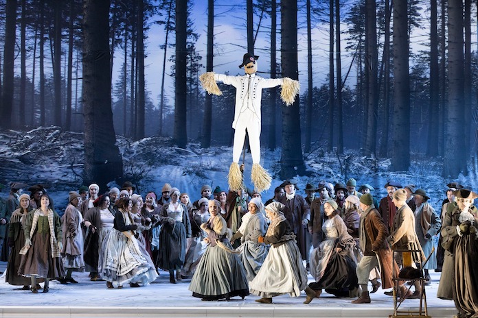Si sviluppa così, al di dentro e al di sotto dell’esile trama dell’opéra-comique, un diverso sentire, un discordante pensiero che delinea una sorta di itinerario da romanzo di formazione che insieme coinvolge i due protagonisti: entrambi proveranno ad assumere abiti che escono dal loro quotidiano e semplice mondo, come attori che assumono diverse sembianze, cambiando d’abito per recitare la propria commedia come su un palcoscenico, il metateatro diventa chiave di comprensione di un mondo e di un itinerario di vita. E così muta, il talentuoso regista, senza darlo troppo a vedere, oltre alla storia anche la geografia di questo strano paese immerso, con l’attiva e feconda complicità del disegno di Paolo Fantin, nel bianco assoluto di una scena essenziale dalla disarmante semplicità: nel primo atto tre quinte che s’incrociano con una pedana, al centro un traliccio praticabile che non rivela subito la sua vera natura, coperto com’è da un velario d’alte conifere, a terra un tronco d’albero come unico elemento di tipicità dell’universo “maschile”.