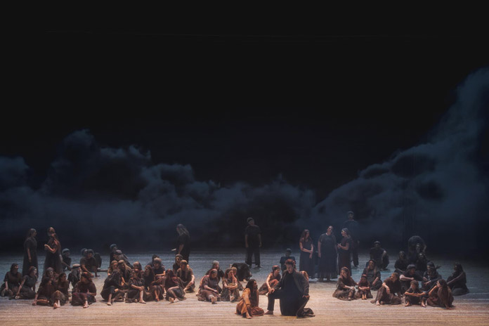 La regia di Wenders, qui ripresa da Derek Gimpel, sembra rispondere a questa duplice natura. Lungi dall’insistere sull’esotismo pittoresco, il regista sceglie un’essenzialità visiva che ricorda la rarefazione poetica di certo suo cinema: una scena ridotta a pochi drappeggi e una tenda di blu profondo, costumi atemporali e volutamente neutri, luci di Olaf Freese –riprese da Oscar Frosio – che scolpiscono lo spazio più che decorarlo. Ne deriva uno spettacolo dove il movimento è ridotto al minimo, calibrato con attenzione sul ritmo musicale. I video, però, immagini marine e di spiagge da cartolina, non convincono del tutto, riducendosi a mero didascalismo. D’indubbio fascino, invece, la scena finale del primo atto, quando Leïla si protende sospesa verso un onirico e sognante cielo stellato.